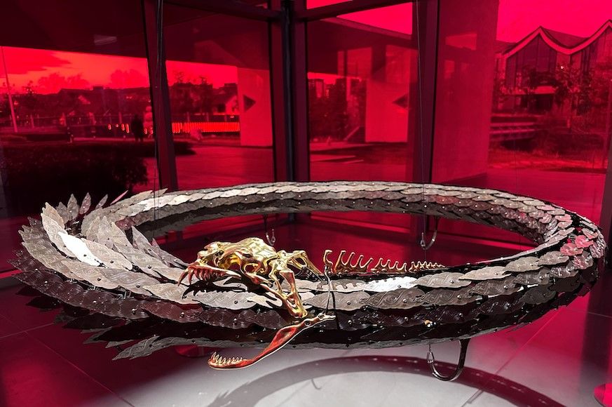 崔旴嵐,《衔尾蛇》,2012年,金属材料、树脂、24K金箔、电机、机械装置、定制CPU电路板,上海余德耀美术馆展览现场,摄影:薛莉人类永无止尽的欲望,是崔旴嵐创作的母题之一。在人工智能、基因工程、分子生物等科技领域大发展的背景下,人类的欲望正在被毫无边界地放大,并借助科技手段被满足。崔旴嵐的作品,比如《衔尾蛇》(Ouroboros),蛇在一圈一圈永无止境地游弋中吞噬着自己,而运行着的精致金属机械蛇头,则让这个过程变得狰狞恐怖,触人心弦。