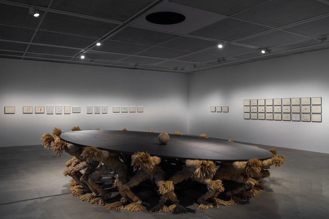 崔旴嵐,《圆桌》,2022年 铝、人工稻草、机械装置、动作捕捉相机、电子设备 韩国国立现代美术馆收藏 © Choe U-Ram,上海余德耀美术馆展览现场,2025余德耀美术馆副总监、策展人施雯则提到:“我们除了关注本地艺术家之外,比较青睐关注人类当代生存现状、探索自我的艺术作品和展览。”无论是当下崔旴嵐个展、还是2025年的德国艺术家维尔纳•巴特纳(Werner Büttner)个展“傻瓜,离开避世之所吧” (Fool, Leaving the Shelter of Seclusion),或者摄影先驱托比永•罗兰德(Torbjørn Rødland)的中国首次个展“致太阳” (Songs for the Sun)等,无不具有这种气质。而在崔旴嵐个展中的作品《圆桌》(Round Table)中,一群稻草人弯腰背负一张大圆桌,圆桌上的圆球滚来滚去,永不停歇,很容易让观者带入“打工牛马”视角,对无休止地进行无意义的劳作产生情感共鸣,因而在社交媒体上被大量转发。